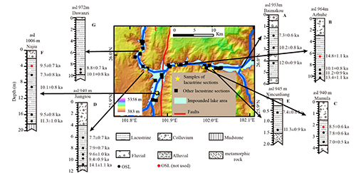 图1 金沙江白马口古堰塞湖中7个湖相沉积剖面的年代和分布特征