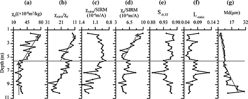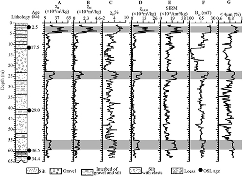 图2 岩石磁学指标反映了岷江第三级阶地沉积中的三次成壤事件(阴影)