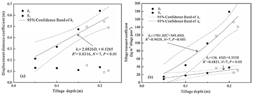 不同耕作位移参数和耕作深度的关系:a)位移距离系数;b)耕作传输系数