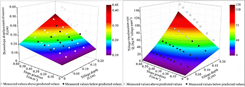 研究认为,在耕作工具宽度保持一致的前提下,作为构成接触面积要素之一的耕作深度,能够成为替代耕作过程中的土壤——耕具接触面积指标研究土壤运动特征。结果表明,随耕作深度的增大,平均土壤移动距离呈线性增加趋势,而且在陡坡且深耕的情况下,这种关系变得更为显著。研究也发现,土壤位移速率随耕作深度增大呈现二次函数增加的趋势,与坡度仅表现为线性关系,表明耕作深度对耕作位移速率的影响较坡度影响更大。通过类比,研究认为构成土壤——耕具接触面积的另一个要素,即耕作工具的宽度,也是影响坡耕地土壤位移和土壤侵蚀的重要因素。因此,土壤移动距离、土壤位移速率均直接受制于土壤——耕具接触面。