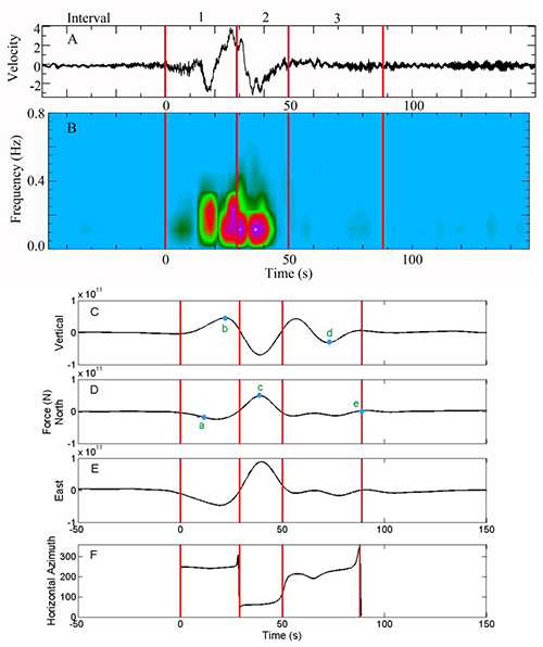 台站GZI的原始波形(已去除仪器响应)、频谱图、反演所得的力—时间函数以及水平力的方位角