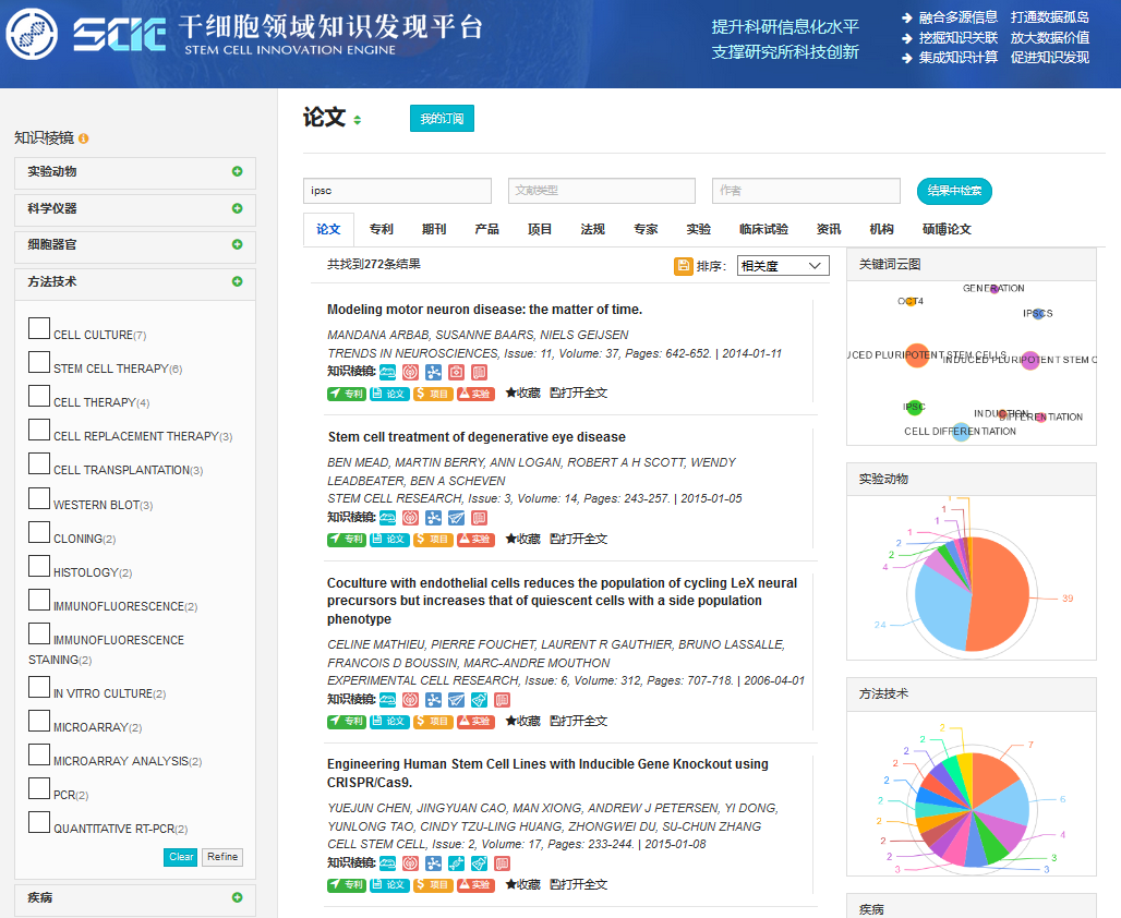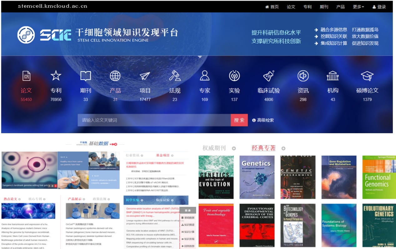 12月4日,由中国科学院成都文献情报中心与广州生物医药与健康研究院联合研建的“干细胞知识发现平台” (http://stemcell.kmcloud.ac.cn)正式建成试运行。平台围绕干细胞领域知识发现对科研信息化的需求,结合成都文献情报中心科技信息数据资源与广州生物医药与健康研究院干细胞领域科研优势,重点提供干细胞领域科技大数据集成、知识计算及基于大数据知识计算的知识发现等三类知识服务。平台建设与服务的宗旨是融合多源信息、打通数据孤岛,挖掘知识关联、放大数据价值,集成知识计算、促进知识发现。