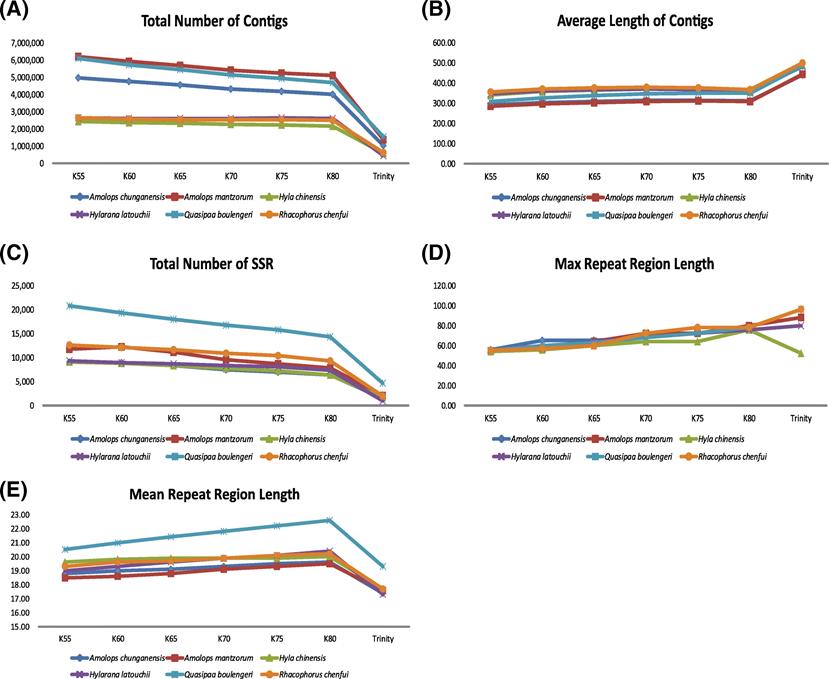 成都生物研究所曾晓茂研究员团组成员夏云博士,针对两栖类微卫星跨物种扩增困难,而高通量测序相对便利的背景下,探讨了不同来源,不同拼接方法,测序深度等对微卫星筛选结果的影响。对利用高通量数据筛选微卫星标记提供了综合性的评估。研究发现,微卫星筛选的数量随着数据量及读长的增加而增加。数据拼接的策略会显著影响微卫星的筛选结果,即K值越大,产生的微卫星数量少,但这些位点的重复次数多,暗示了更高的多态性。另外,转录组得到的微卫星位点相对于基因组位点显示出较低的多态性但更易于与功能位点相关。