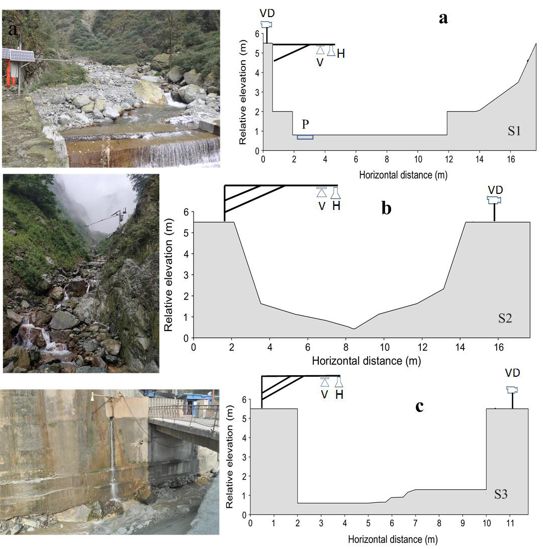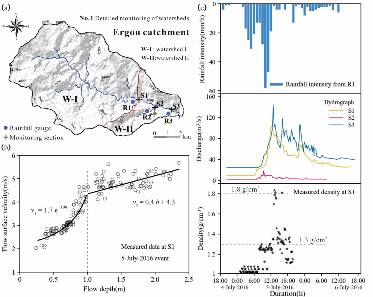 2016年7月5日泥石流过程和相关数据分析:(a) 洱沟监测设备布设图; (b) 流速-水深关系; (c) 2016年7月5日事件的降雨、径流和密度监测成果
