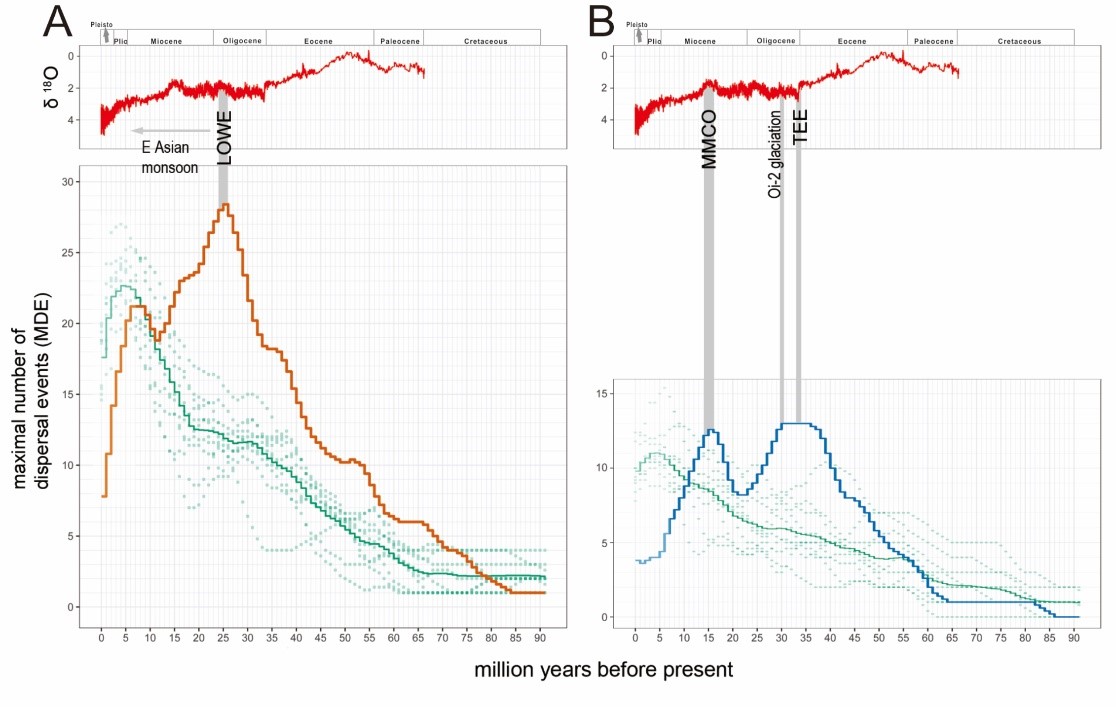 研究进一步揭示了欧亚大陆和北美大陆之间随时间变化的动态模式。在从欧亚大陆到北美大陆的方向上,约65百万年前(Ma)以来的温暖气候使这一方向的物种扩散事件不断增加,在经历始新世-渐新世边界(~35 Ma)的冰期气候恶化事件时,扩散事件增速急剧降低,之后气候回暖,扩散事件进一步增加,直到约25 Ma达到峰值,之后的降温事件以及东亚季风气候的形成,造成了扩散事件的下降,虽然在中新世气候平台期(~20-15 Ma)有一次减缓,但总体下降趋势不变。
