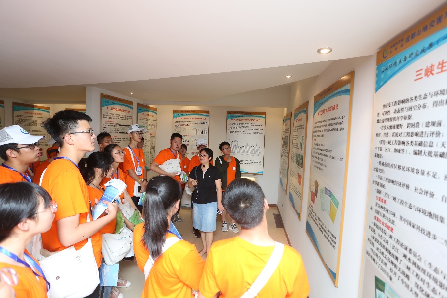 随后,营员们参观了综合测试与模拟实验中心和成都山地所科技展馆。在泥石流模拟实验大厅,代志强老师给同学们讲解了泥石流的发生原理和过程,并带领同学们观摩了正在进行的科学实验。同学们还同实验大厅的老师和研究生们进行了交流。在成都山地所科技展馆,通过马雅阁老师的介绍,同学们了解了中国地形及山地灾害的分布、成都山地所发展史、山地科学主要研究成果以及科技平台建设等内容。