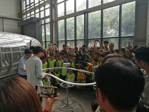 研学活动第二站是西南交通大学牵引动力国家重点实验室。同学们跟随指导老师参观实验室的机车、大型机械以及中国第一条载人高温超导磁悬浮试验线,现场观摩了360度自由磁悬浮模型试验。通过与老师互动,了解了磁悬浮列车的悬浮原理和相关技术,随后同学们分组乘坐体验了高温超导磁悬浮小车。