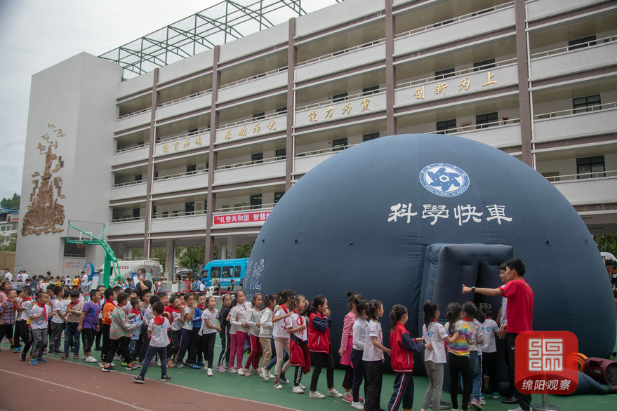 在操场中央一个半球体的充气设备前,孩子们排着长长的队伍,等着进入最受欢迎的“球幕影院”中。排队等待的孩子焦急又兴奋,不断向已经体验过的同学打听“里面是啥子?”“好不好看”……听着已经在里面体验的同学“哇……”“啊……”的喊声,外面排队的孩子脚尖踮起了,耳朵也竖起了,恨不得马上进去。据绵阳科协相关工作人员介绍,这座球幕充气影院采用360度球幕播放科普视频,能让孩子们更直观地体验科学探索,领略科技魅力。