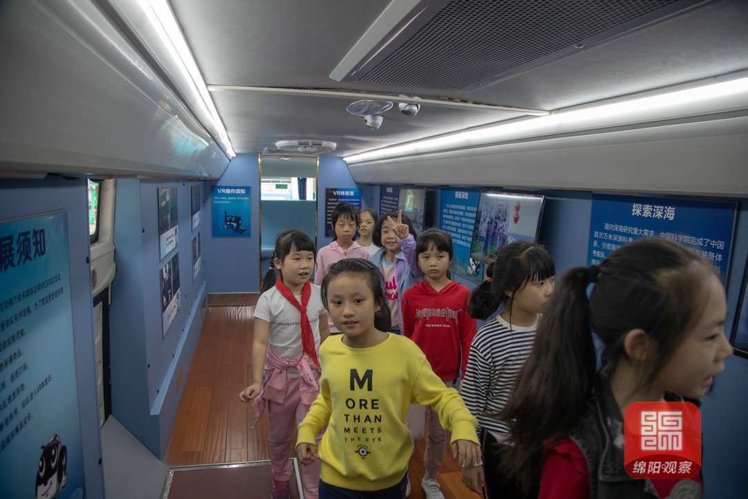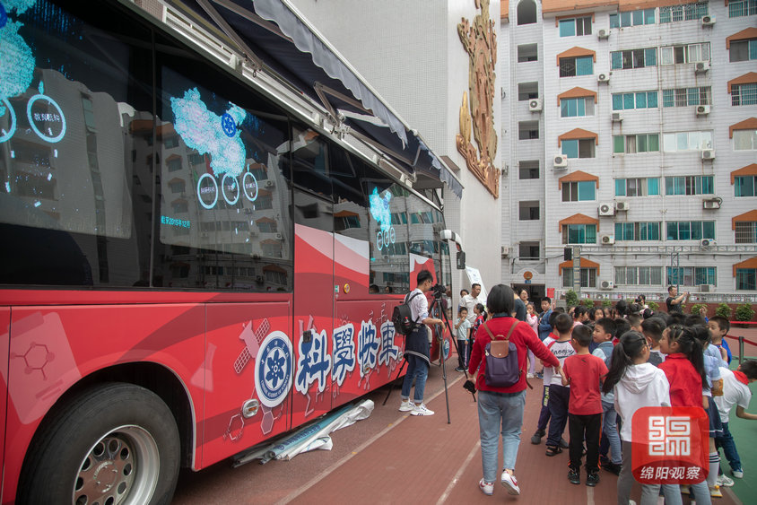 中国科学院的科学快车是第一次来绵阳。它集车厢内展厅、户外可移动展区、球幕充气影院为一体,车厢内互动展厅利用沉浸式环境和交互式手段,让富乐实验小学的孩子们在参与中体验神奇的科技世界。