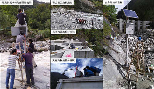 随后,项目团队利用国庆假期时间,连续奋战十余天开展了基础建设、设备安装及现场测试等工作,在培龙沟、古乡沟、天摩沟顺利安装了泥水位计、雨量计、地声、视频等泥石流监测设备。