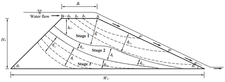图1. 堰塞坝沿流动方向的漫顶溃决模型