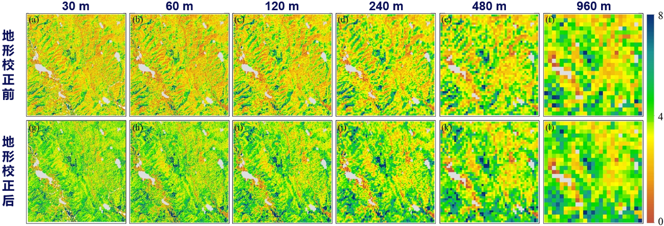 融合多源多尺度遥感数据,借助集合多尺度滤波算法,兼顾不同分辨率遥感影像间的信息传递过程,构建了复杂山地多尺度LAI遥感反演模型,生成了960 m、480 m、240 m、120 m、60 m和30 m尺度LAI数据集。研究发现,随着空间分辨率的增加,山地LAI空间纹理信息和变化过程逐渐丰富,且地形对LAI遥感反演的影响愈加显著;消除地形对遥感信号的辐射畸变能够显著改善不同坡度条件LAI反演精度,极大提升了多尺度LAI估算结果的空间一致性及表达能力。