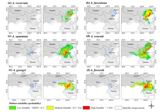 图1 当前西南山地六种冷杉的分布点位及模拟的潜在分布区