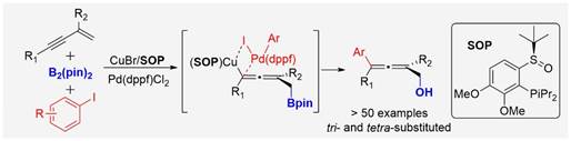 手性联烯广泛存在于天然产物、药物分子和有机材料中,同时,作为重要的合成子,常用于各类重要骨架的构建。传统制备手性联烯的方法主要基于消旋体拆分或手性底物的手性转移。发展高效合成手性联烯的新技术、新方法一直是化学家们关注的一个重要课题。