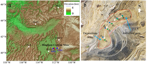 Bingham滑坡是北美地区有准确记录以来非火山喷发引起的第二大规模滑坡,发生在全球最大的露天采矿区,且连续发生了多次滑坡,是非常典型的矿山滑坡,具有极大的影响力。在何思明研究员指导下,博士研究生张振利用经验格林函数评估了两次滑坡动力特性,根据两次滑坡地震信号的差异剖析了滑坡整体运动以及局部碰撞产生信号所在的频率区间,为评估地震高频信号中的地质灾害动力学特征做出了重要探索。