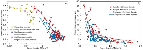 研究团队通过收集近280组岩石高速旋转摩擦试验数据,将试验岩样分为高温下稳定矿物(包含石英,正长石,斜长石等)、高温下发生脱水反应矿物(包含高岭石,蒙脱石,石膏等)和高温下发生脱碳反应矿物(石灰石,大理石等)三类。通过对试验数据进行整理、拟合和分析(图1)发现,功率密度弱化模型相对于速度弱化模型和法向应力弱化模型具有更好的趋势和相关性。通过对比不同尺寸式样(25mm直径,40mm直径,1m长宽)的摩擦系数及弱化距离变化趋势,发现式样尺寸越大,摩擦系数和弱化距离下降得越早,这种重要的尺寸效应将为我们推广实验尺度变化趋势到自然滑坡尺度提供重要支撑。