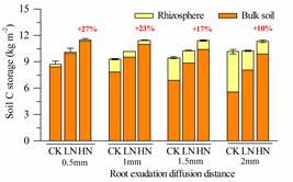 在此基础上,结合根际空间数值模型,进一步模拟了不同根际范围(分别为距离根表面0.5mm, 1mm, 1.5mm和2mm的距离)情景下根际与非根际土壤C库变化对土壤C存储的贡献幅度与方向(图 1左)。模拟分析表明:各个根际空间尺度下,施氮降低了根际C库储量(降幅为0.11~3.01 kg C·m-2),而增加非根际C库储量(增幅为1.91~4.08 kg C m-2)。相应地,沿不同根际范围模拟情境下,生态系统土壤总SOC储量增幅介于0.74~2.44 kg C·m-2之间。特别地,以根际距离2mm为例,构建了N添加下高寒灌丛根际/非根际土壤C库动态对土壤固碳潜力相对贡献的概念框架:在根际土壤 “碳源”效应(损失3.01 kg C m-2)与非根际土壤“碳汇”效应(积累4.08 kg C m-2)二者的叠加作用下,N沉降下灌丛生态系统土壤C库储量增加量为1.07 kg C m-2(图 1右)。上述结果表明N沉降下陆地生态系统土壤固C潜力在很大程度上受根际C动态过程及其根际空间范围所调控。