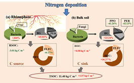 针对上述科学问题,中科院成都生物研究所尹华军研究团队以青藏高原东缘代表性高寒灌丛---鲜卑花灌丛为研究对象,基于长期N添加(0,50,100 kg N ha-1yr-1)野外试验样地,区分和辨识了长期N沉降对高寒灌丛根际与非根际土壤C库的影响差异。基于上述研究,首次发现氮添加下根际/非根际在土壤C 存储贡献中表现出截然相反的功能。具体而言,在根际区,氮添加促进微生物活性而加快土壤轻组分有机C分解,导致根际有机C含量显著下降,使得N沉降下根际区表现出“C源”功能。相反地,在非根际区,氮添加通过抑制氧化酶的活性增加重组有机C积累,导致非根际有机C含量显著提升,使得非根际区表现为“C汇”功能。