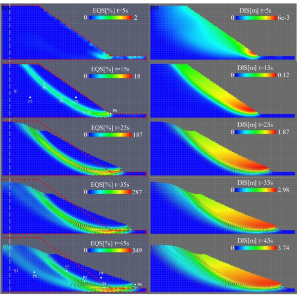 降雨-渗流潜蚀诱发滑坡过程中等效剪切应变与水平位移模拟结果