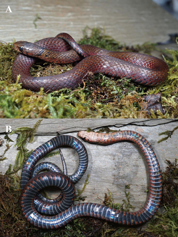 图1 螭吻颈槽蛇Rhabdophis chiwen sp. nov. (A侧面照,B腹面照)