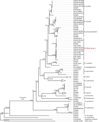 图2 基于cmos与cyt b片段构建的颈槽蛇属部分物种的系统发育树,红色标注支系为螭吻颈槽蛇R. chiwen sp. nov.