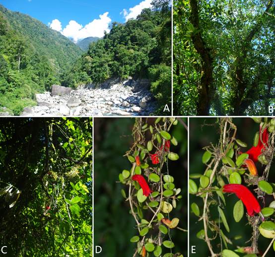 (A:季雨林景观B:附生植物C:枯枝上附生的贝叶芒毛苣苔 D:植株 E:花)