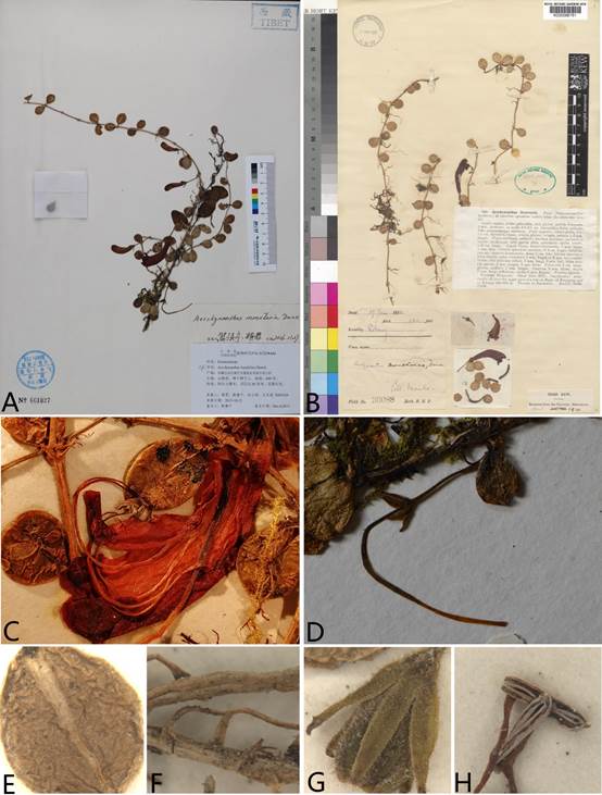 图2. 贝叶芒毛苣苔腊叶标本及局部器官形态照片