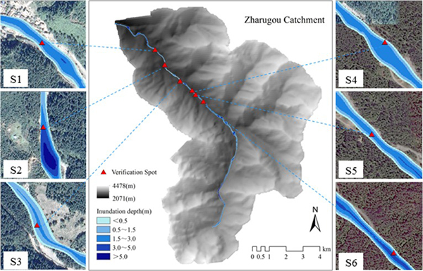 为将体积法应用于高落差小流域山洪淹没计算,中科院成都山地所数字山地中心研究团队提出了一种基于微分思想的微分体积法。该方法将流域主沟道划分成若干微分沟道,使得微分沟道内的高程落差相对较小,从而可以将对应微分流域内汇集的最大瞬时径流量,运用体积法在该微分沟道的数字地形模型(DEM)上计算得到洪水淹没范围,然后将所有的微分沟道淹没区域合并就能获得整个主沟道的山洪淹没范围。同时,还提出了微分沟道最佳划分数量的选择判定方法。研究以九寨沟风景区内的扎如沟流域为试验区,计算获取了2018年7月10日暴发的10年一遇山洪的近似最大淹没范围。计算结果与现场采样数据吻合较好,证明了微分体积法在高落差小流域山洪最大淹没范围计算中的可行性和有效性,较好地解决了在缺少实测水文资料的高落差小流域中快速获取山洪最大淹没范围的难点问题。