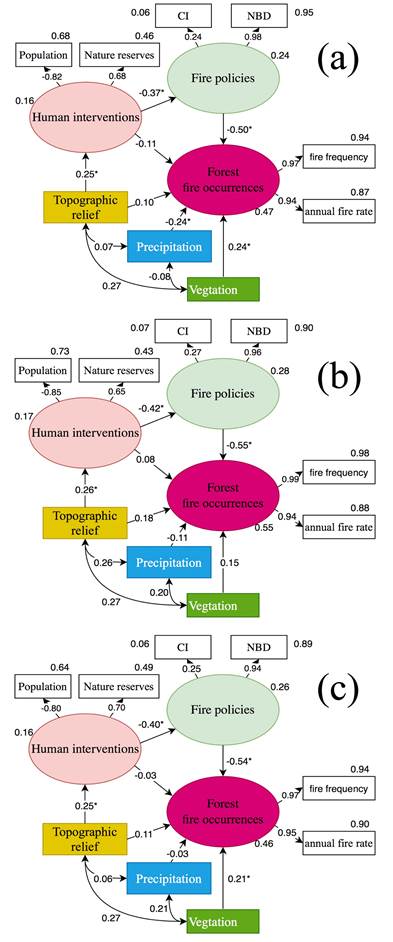 为解决以上问题,中国科学院成都生物研究所生物多样性与生态系统服务领域地表过程与生态系统管理项目组熊勤犁、罗小金等与四川农业大学、中山大学及全球多家研究机构合作,以西南地区森林为研究对象,应用最大熵(Maxent)算法预测森林火灾风险等级时空分布,创造性的开发出森林防火政策影响力的相关量化指标,解决了过去林火归因研究中残差偏大的问题,并通过冗余分析(RDA)确定多达55个森林火灾驱动因素(包括森林防火政策、人为干扰、气候、地理地形、植被及土壤类型等因子)对其发生的贡献。此外,利用结构方程模型(SEMs)确定森林防火政策、人为干扰和生物物理变量之间的关系强度及其对森林火灾发生的直接和间接影响。相关研究结果表明,Maxent模型可对中国西南地区森林火灾分布进行精准预测,西南地区可能发生森林火灾面积为3.25×105 km2,主要集中在研究区域南部靠近国境区域以及云南、四川交界区域。森林火灾更易在各个边界(国界和省界)地区发生。春季云南中部和川东森林火灾危险区面积增加。森林防火政策实施情况好坏是是否引发森林火灾的决定因素,其次是生物物理因素和人为干扰,这些应被视为设计森林防火方案的关键因素。虽然因为时空差异,各驱动因素的对林火发生贡献各不相同,但代表森林防火政策影响力的边界指数(NBD)和政策传导指数(CI)始终是关键的驱动变量。人为干扰对火灾发生概率没有显著的直接影响,而通过防火政策的人为干扰对火灾发生概率降低有显著的正向影响。建议加强森林防火政策实施能力,加强对边境地区、少数民族地区、人口密度低地区、教育程度低地区居民的防火宣传教育,提高当地居民对森林防火政策的认知并使之遵循。