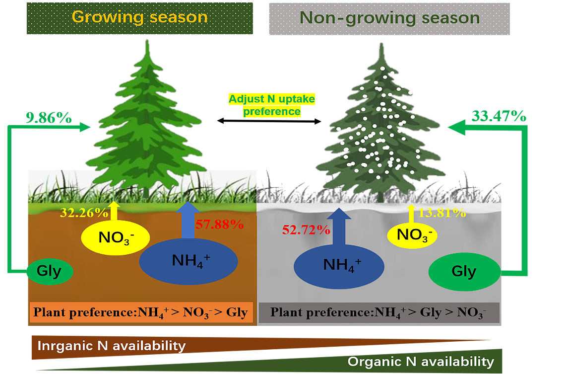 植物氮(N)素获取策略在调节植物生长和生态系统功能方面发挥着重要作用。通常认为植物对养分的需求和获取主要发生在生长季,而在光合作用不活跃、植物生长缓慢的非生长季,植物对养分的吸收非常有限,这使得有关森林植物氮素获取的研究大多局限于生长季。然而,已有证据表明,植物在非生长季仍然具有相当大的氮吸收能力和养分需求。忽视季节变化可能引起的土壤氮库动态变化和植物氮吸收差异,很大程度上限制了对森林氮养分利用策略和生态系统氮循环的认知水平。