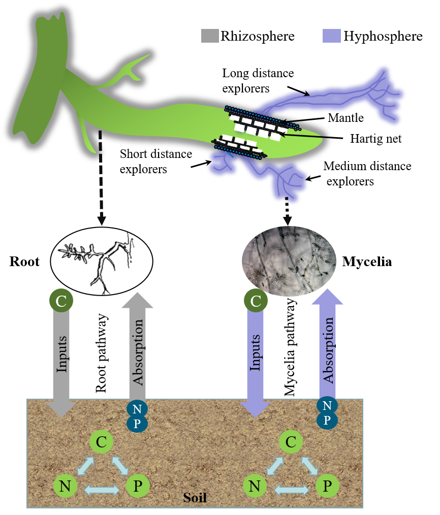 另外,研究团队前期所开展的一项关于高寒森林根系/菌丝途径调控植物氮吸收的研究也受到了国际同行的广泛关注。2020年6月,应国际土壤学权威期刊《Soil Biology & Biochemistry》主编Karl Ritz教授邀请,森林生态过程与调控项目组张子良博士和尹华军研究员针对该研究中所提出的“根系途径”和“菌丝途径”概念框架、生态学内涵(图2)、以及本研究技术/方法的有效性和适用性进行了深入的讨论。相关内容近期以“Letter to the Editor”的形式发表在《Soil Biology & Biochemistry》 (2020)上,并得到了Karl Ritz教授高度评价。