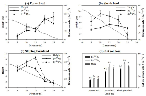 基于137Cs和210Pbex测得的林地(a)、灌木林地(b)和坡耕地(c)土壤侵蚀率的顺坡变化以及三种土地利用的净土壤流失(d)