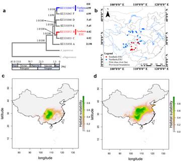 图1. 中国大鲵进化显著单元的系统发育关系(a)、分布点位(b;蓝色和红色圆点分别为北部ESU和南部ESU的分布点位)、以及当前北部ESU和南部ESU的适宜分布区(c-d)