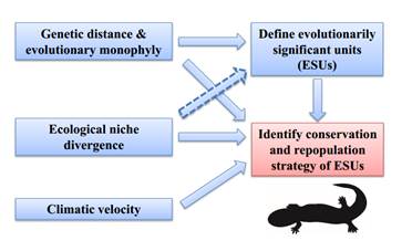 近年来的研究表明,气候变化可能导致中国大鲵适宜栖息地面积的缩减、并呈现往高纬度、高海拔迁移的趋势。同时有研究表明,中国大鲵存在至少5个进化显著单元(ESU)。但气候变化对中国大鲵不同ESU的影响尚不清楚。