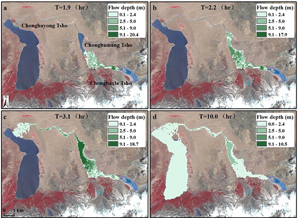研究团队首先基于多源多时相卫星影像分析,修正了冲巴吓错溃决时间。对该湖溃决触发因子进行了深入分析表明,溃决最有可能原因是由于于冰崩入湖,导致湖水漫顶溃坝。通过数字高程模型差分和湖泊水位下降分析,冲巴吓错溃决释放总水量约为27.1±1.6×106 m3,溃坝处的峰值流量大于6600 m3·s-1。研究工作还结合溃坝模型和洪水演进模型,模拟了冲巴吓错溃决洪水的传播途径,重建了冰湖溃决洪水爆发的过程及其影响。