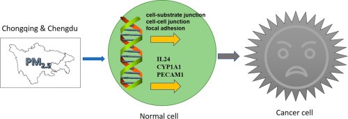 PM2.5严重危害人体健康。由于不同城市大气PM2.5的颗粒物粒径分布、化学组成及来源不同,所导致的健康效应存在差异。本工作以成都、重庆采集的PM2.5样品为基础,探索西南地区大气PM2.5的细胞毒性,氧化应激及基因表达调控。研究发现成渝两地冬夏两季大气PM2.5显著抑制A549细胞活性并诱发氧化应激,且冬季PM2.5存在更强的细胞毒性及更高的氧化应激效应。研究发现成渝冬夏两季大气PM2.5可诱导癌症相关基因,显著作用于共有的癌症相关生物功能,且成都夏季PM2.5的致癌潜力最强。