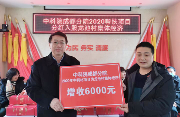会上举行了2020年成都分院项目收益分红入股分红入龙池村集体经济授牌仪式,对驻村干部和15户“一对一”帮扶责任贫困户开展了慰问。