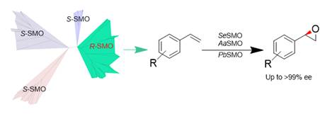光学活性的(S)-和(R)-环氧化物是不对称合成中最重要的手性砌块之一,环氧基团可以与不同的亲核试剂反应,衍生出一系列含各种手性官能团的化合物, 因此其合成研究一直都是有机合成领域关注的热点。其中,烯烃的不对称环氧化是公认的最直接有效的途径。然而,一直以来所报道的各种天然苯乙烯单加氧酶(SMO)的立体选择性都非常单一,只能催化生成(S)-环氧苯乙烯及其类似物,从而削弱了SMO对合成化学家的吸引力,限制了其应用潜力的进一步拓展。