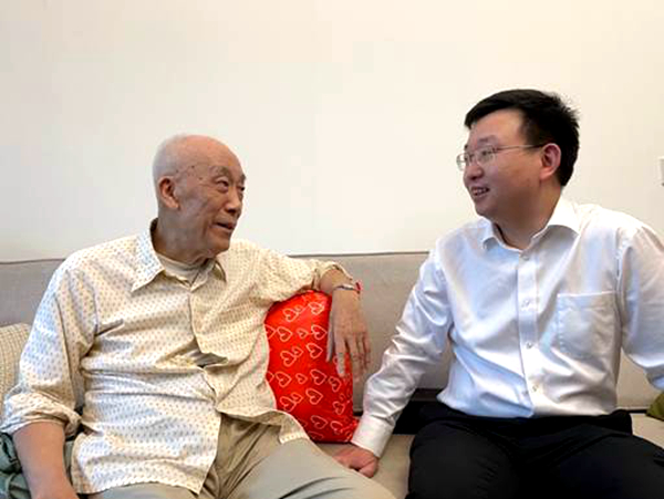 看望中,刘刚君详细询问了刘宝珺院士的健康状况,与院士聊家常、谈专业,并祝愿院士身体健康、生活幸福。刘宝珺院士回忆了自己的工作经历,讲述了和其他老一辈科学家的奋斗历程,并分享了平日喜爱的中华文化。