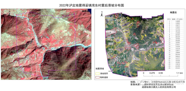 利用四川测绘地理信息局、中国科学院空天信息创新研究院和成都纵横大鹏无人机科技有限公司提供的震前高分-2影像和震后无人机影像,对重灾区得妥镇湾东村3平方公里和磨西镇47平方公里的范围内开展震后滑坡进行解译。湾东村调查区共提取地震滑坡151处,滑坡面积达到0.68平方公里,约占调查区面积的23%。大型滑坡数量较多,投影面积大于1万平方米的滑坡有25处,占滑坡总数的17%。磨西镇调查区共提取地震滑坡704处,滑坡面积达到2.5平方公里,约占调查区面积的5%,投影面积大于1万平米的滑坡有67处,占滑坡总数的10%。