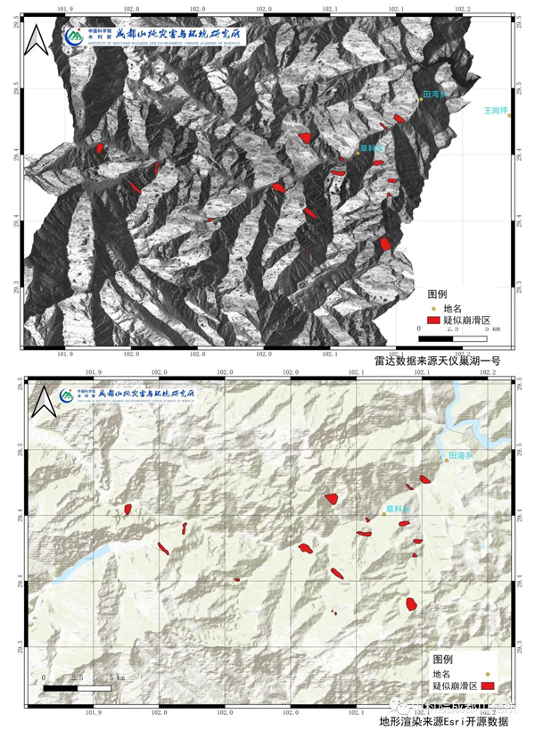 根据国产高分三号、巢湖一号等多源雷达在震前、震后的反射强度变化,结合灾害形成有利地形条件,快速解译震中12km*12km内疑似崩滑区17个(最大面积约为1.56km2)、1处隐患滑坡点,在重点灾区石棉县草科乡解译疑似崩滑区17个。