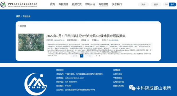 依托成都山地所山地科学数据中心,建立了泸定县6.8级地震专题数据集共享平台,及时分享收集整理的数据和成果,已发布高分三号处理后的SAR数据等研究成果和数据产品,有力支持地震灾情评估,并将持续分享高质量对地观测数据及最新的研究成果。