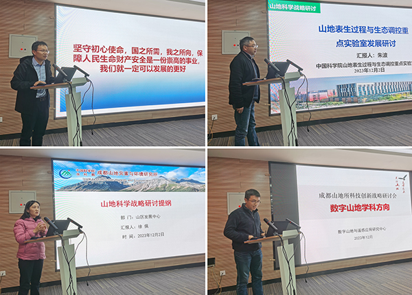 山地灾害与地表过程重点实验室、山地表生过程与生态调控重点实验室、山区发展研究中心、数字山地与遥感应用中心分别结合各自研究领域,从国家重大需求、世界科技前沿、山地科学发展面临的挑战与趋势、面向2030(3+5)重点领域与发展方向、发展目标思路与路径、保障措施与对策建议等方面详细报告了本部门科技创新发展战略和抢占科技制高点的具体举措。研究所学术委员会针对各部门的报告提出了具体的意见和建议。