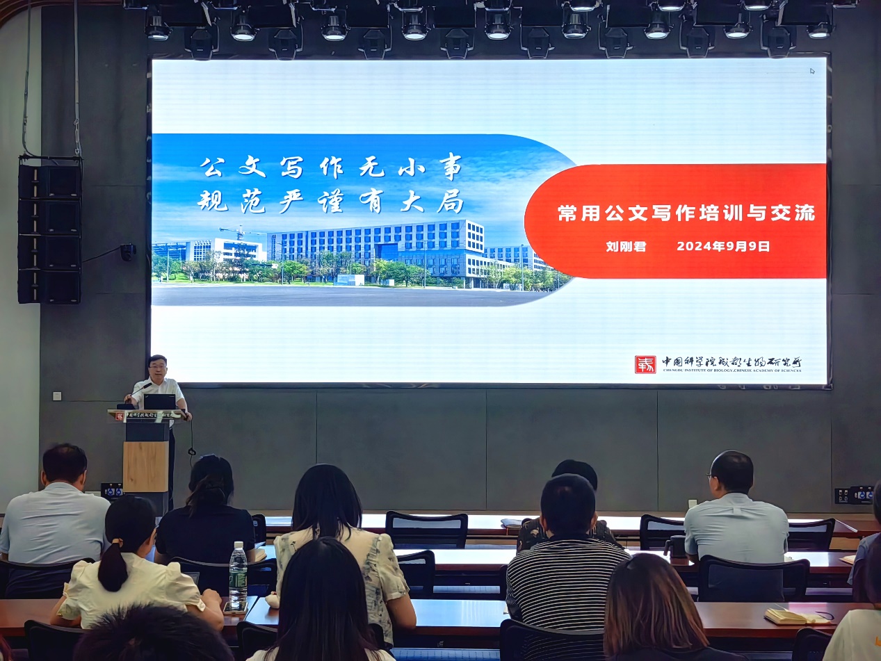 9月9日,中国科学院成都生物研究所举办公文写作培训。党委书记、副所长刘刚君以“公文写作无小事、规范严谨有大局”为全体管理人员、支撑及科研部门涉及公文处理人员近50人进行了公文写作培训。培训由综合办公室主任朱丹主持。