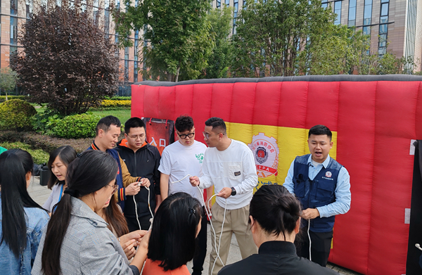 演练特邀四川省消防协会科普教育工作委员会唐自豪教官现场讲解消防安全和现场救援知识。他从火灾的起因到初期火灾的扑救方法,再到火场逃生自救技巧,每一个细节都深入浅出,让参与者掌握实用的安全知识。帐篷逃生、心肺复苏、高层结绳自救等项目让参与演习人员身临其境,学习掌握在火场中基本的逃生方法和火场避难技巧,增强了体验感。