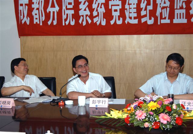 彭宇行院长在会上作了讲话。他说,院属成都地区各单位的党建和纪检监察工作对各单位的改革发展稳定起到了十分重要的政治保证和组织保障作用。他指出,近年来分院系统各单位改革发展的事实证明,各级党组织发挥了战斗堡垒作用,广大共产党员发挥了先锋模范作用。他特别希望各单位行政领导特别是行政一把手一如既往地重视和支持党建和纪检监察工作,这是义不容辞的责任。只有党政合一、互相支持、充分信任、团结进取,才能把单位的各项工作推上一个新的水平。
