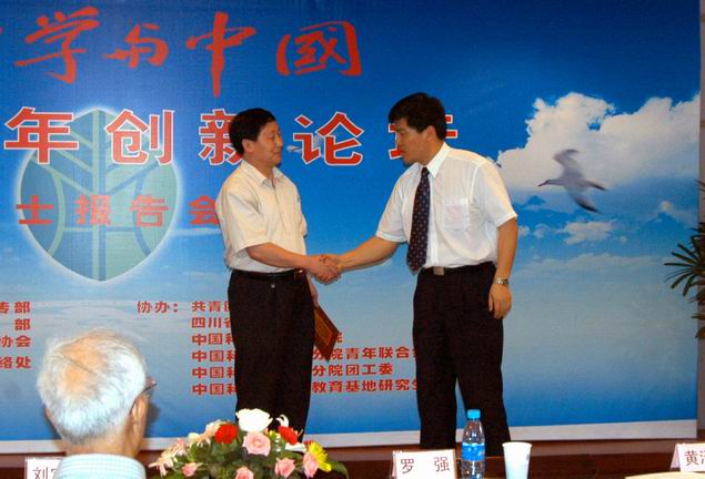 论坛结束后,团省委统联部副部长、省青联副秘书长余力宣读共青团四川省委《关于表彰2004年度四川省青年职工“双争双创”活动先进集体和先进个人的决定》、《关于表彰2004年四川省青年“创新带头人”的决定》,其中,成都有机化学有限公司党委副书记、监事会主席伊甫申获得“四川省优秀党政领导关怀青工工作奖”,成都有机化学有限公司不对称合成与手性技术四川省重点实验室获得“四川省青年文明号”称号,成都文献情报中心咨询部主任邓勇获得四川省“管理创新带头人”称号,成都计算所工业计算机应用事业部副经理陈斌获得四川省青年“技术创新带头人”称号。团省委书记、省青联名誉主席罗强为受表彰的单位和个人代表颁发了奖牌和证书。