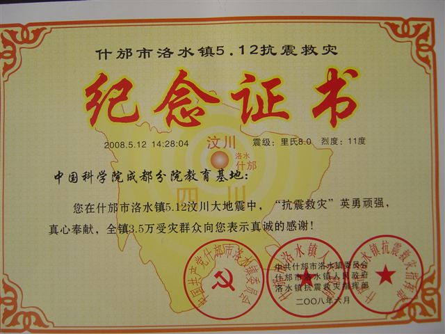 中科院成都教育基地研究生服务团心理援助自愿者活动是由成都教育基地、成都分院团工委、成都分院科技合作处共同推动和组织的。同学们在绵竹体育场灾民集中安置点、东汽以及什邡洛水镇洛水村等地服务期间,努力践行中科院领导关于中科院的研究生要在抗震救灾中发挥表率作用的要求,顶着酷暑不辞辛劳地努力工作,很好地完成了深入灾民家中开展面对面的互动交流,参与相关社会问题调查访谈、协助中科院心理所培训当地大学生志愿者团队、结合自己的专业知识如用生态学的相关研究方法为东汽厂的灾后重建提供建议以及相关调查报告的撰写等任务,在服务中与当地灾民建立了依依不舍的友情。他们以自己的实际行动展示了中科院研究生的精神风貌,受到了当地政府、老百姓好评。中国共产党什邡市洛水镇委员会、什邡市洛水镇人民政府、什邡市洛水镇抗震救灾指挥部向每一位同学和成都教育基地颁发了“什邡市洛水镇5.12抗震救灾纪念证书”,以表达洛水镇3.5万受灾群众对同学们辛勤工作的肯定和真心奉献的感谢。中科院心理所5.12汶川地震心理援助队负责人给成都分院领导发来短信:成都教育基地派来的10名研究生志愿者在绵竹、什邡表现非常优秀,谢谢成都分院!服务团在灾区工作期间,成都教育基地和成都分院团工委负责人专程到绵竹、什邡慰问了同学们并向同学们赠送了慰问品。