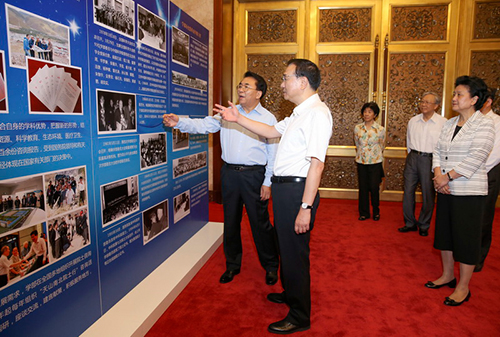 7月27日,中共中央政治局常委、国务院总理李克强在北京出席国家科技战略座谈会并作重要讲话。这是座谈会前,李克强观看中科院学部历史沿革、科研成果以及科技战略咨询图片展示。中新社 刘震摄