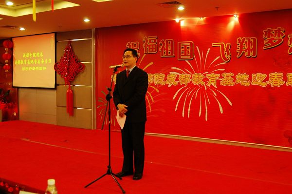 2009年1月9日下午,中科院成都教育基地举行了“祝福祖国 飞翔梦想”研究生迎春联欢会。中科院成都教育基地学委会主任、中国工程院院士林祥棣,成都分院院长、教育基地管委会主任彭宇行,分院党组书记、副院长袁家虎,副院长赵永涛,党组副书记彭丽玲,成都山地所所长、成都教育基地管委会委员邓伟,成都信息技术公司董事长、党委书记王晓宇,光电所副所长范天泉,成都生物所副所长叶彦,成都有机公司副总经理、教育基地管委会委员邓金根,成都山地所副所长程根伟,成都信息技术公司党委副书记宋昌元等院所领导来到联欢会,与200多名研究生、导师代表以及来自电子科技大学、西南交通大学等成都地区高校研究生会的代表欢聚一堂,共话美好明天。 联欢会在欢快祥和的气氛中拉开帷幕。成都分院院长、成都教育基地管委会主任彭宇行发表了热情洋溢的致辞。彭宇行说,2008年成都分院的研究生教育事业在各培养单位的大力支持下蓬勃发展,不断进步。成都教育基地在全力组织研究生团结一心、共赴国难,抗震救灾,组织形式多样的社会实践活动,特别是科技救灾专项社会实践;不断创新研究生教育模式,着力研究生综合素质教育,深化人文教育内涵;以人为本开展研究生教育管理,推动丰富多彩的校园文化活动;等方面开展了富有成效的工作。彭宇行强调,2009年我们将进一步按照路甬祥院长在中科院坚持科教结合培养创新人才研讨会上对中科院研究生教育事业提出的“进一步解放思想、改革创新,在创新教育、培育造就创新人才的实践中发挥先导与示范作用,实现中国科学院教育事业创新跨越、持续发展,为国家富强和民族振兴做出应有的贡献”的要求,携手成都地区各培养单位,充分发挥综合优势,共同推动院所共建共管的研究生教育管理体系建设,积极探索科教结合培育人才的机制和模式,努力为创新型国家培养更多的创新人才! 联欢会期间,由分院领导、管委会、学委会及各培养单位的领导分别为中科院成都分院院长奖学金、成都分院优秀导师、成都教育基地科技救灾专项社会实践优秀项目的获奖者颁发了证书和奖金。 在联欢会上,同学们表演的舞蹈、独唱、街舞、笛子独奏、自己创作的相声、小品和穿插在节目中的抽取幸运观众奖等活动,不时将现场气氛推向了高潮。 演出结束后,出席联欢会的领导与演员和同学们合影留念。
